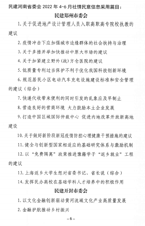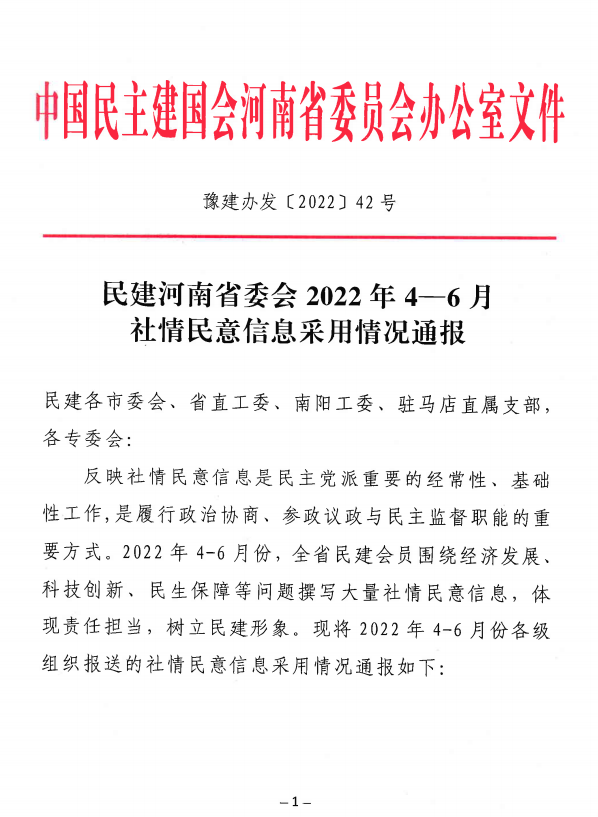 民建河南省委会2022年4-6月社情民意信息采用情况通报