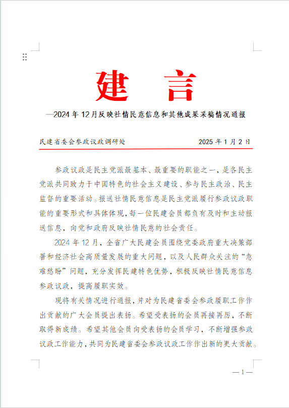 12月30日至31日上午,民建中央2024年参政议政年会在北京召开。民建中央常务副主席秦博勇出席会议并讲话,孙东生副主席作2024年参政议政工作报告,李世杰副主席主持会议。秦博勇指出,一年来,全会深入学习贯彻习近平新时代中国特色社会主义思想,全面贯彻落实中共二十大和二十届二中、三中全会精神,聚焦高质量发展首要任务,发挥会的特色优势,在参加政治协商、开展民主监督、反映社情民意、开展议政调研、举办论坛研讨等方面,开...